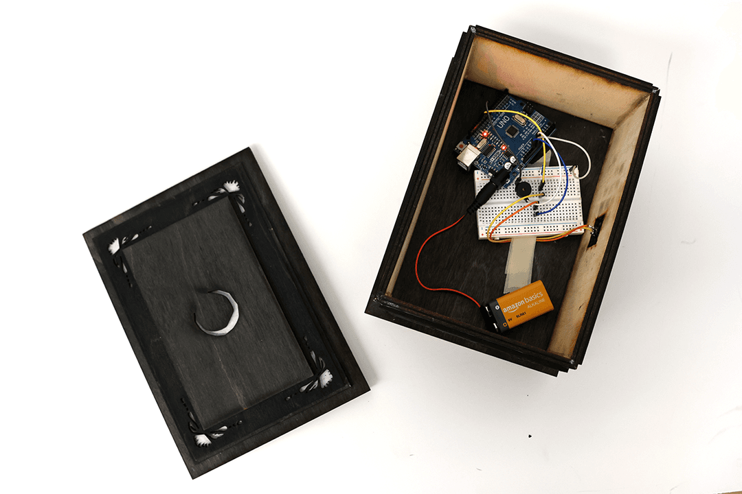 A nod to the ballerina music boxes of childhood past, the box plays the melody with the press of a button through an Arduino buzzer.