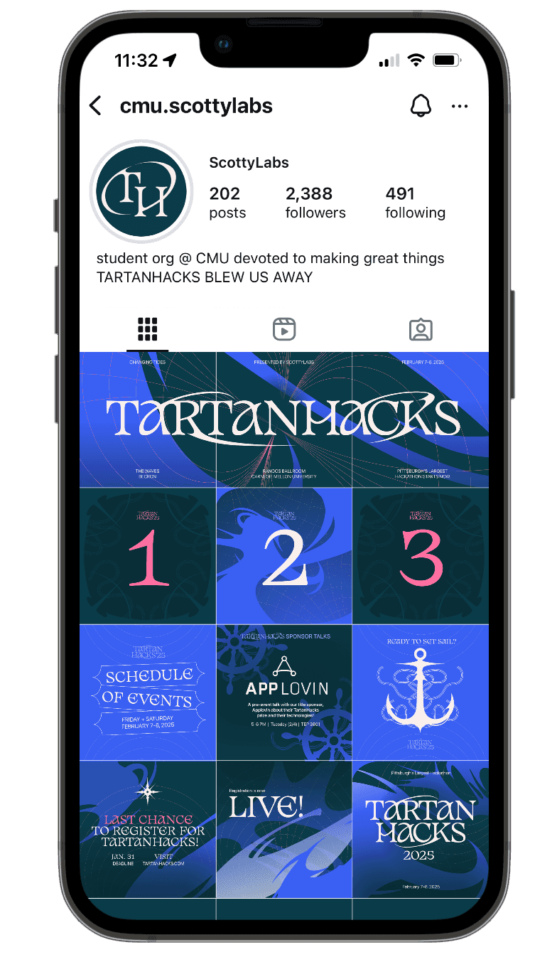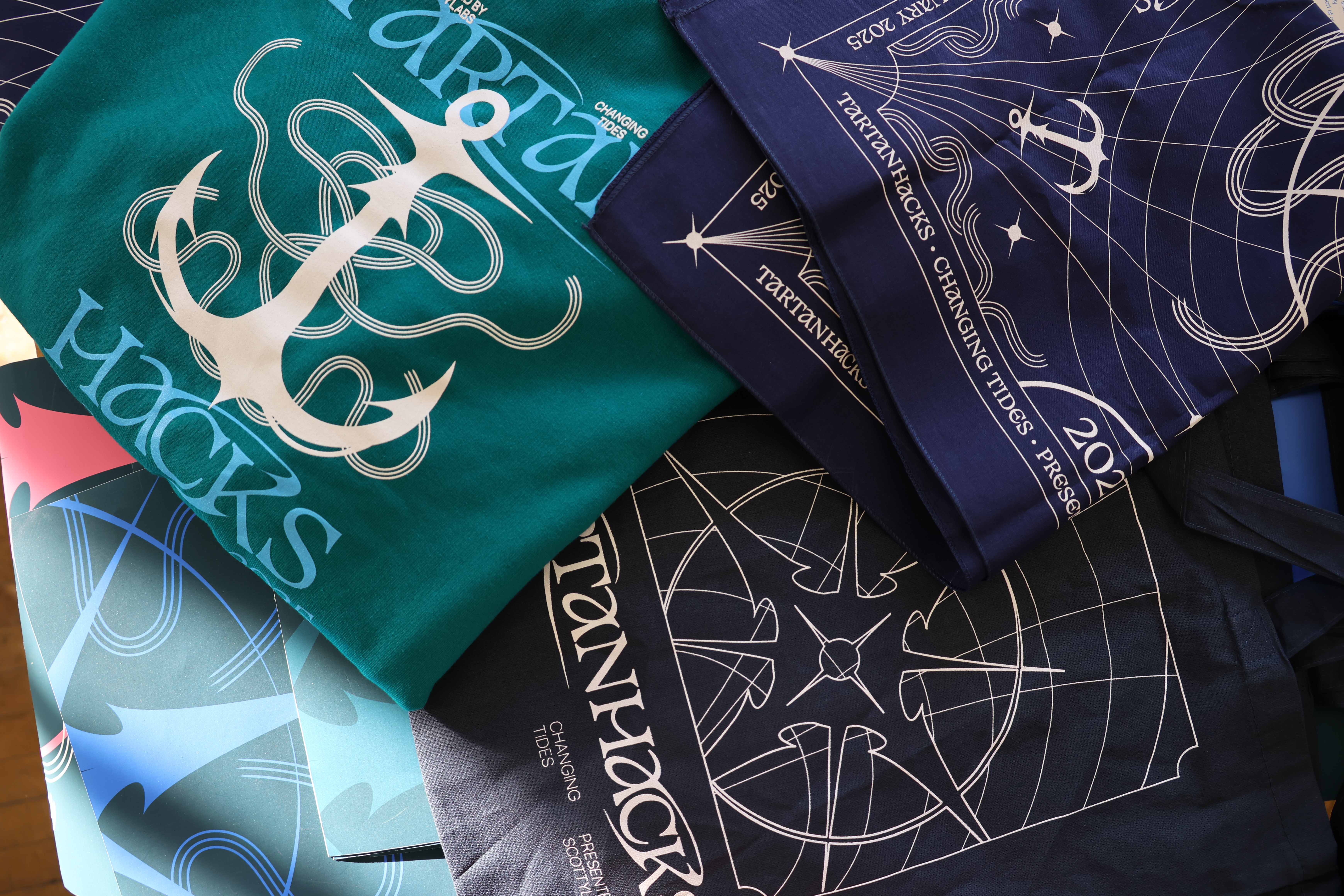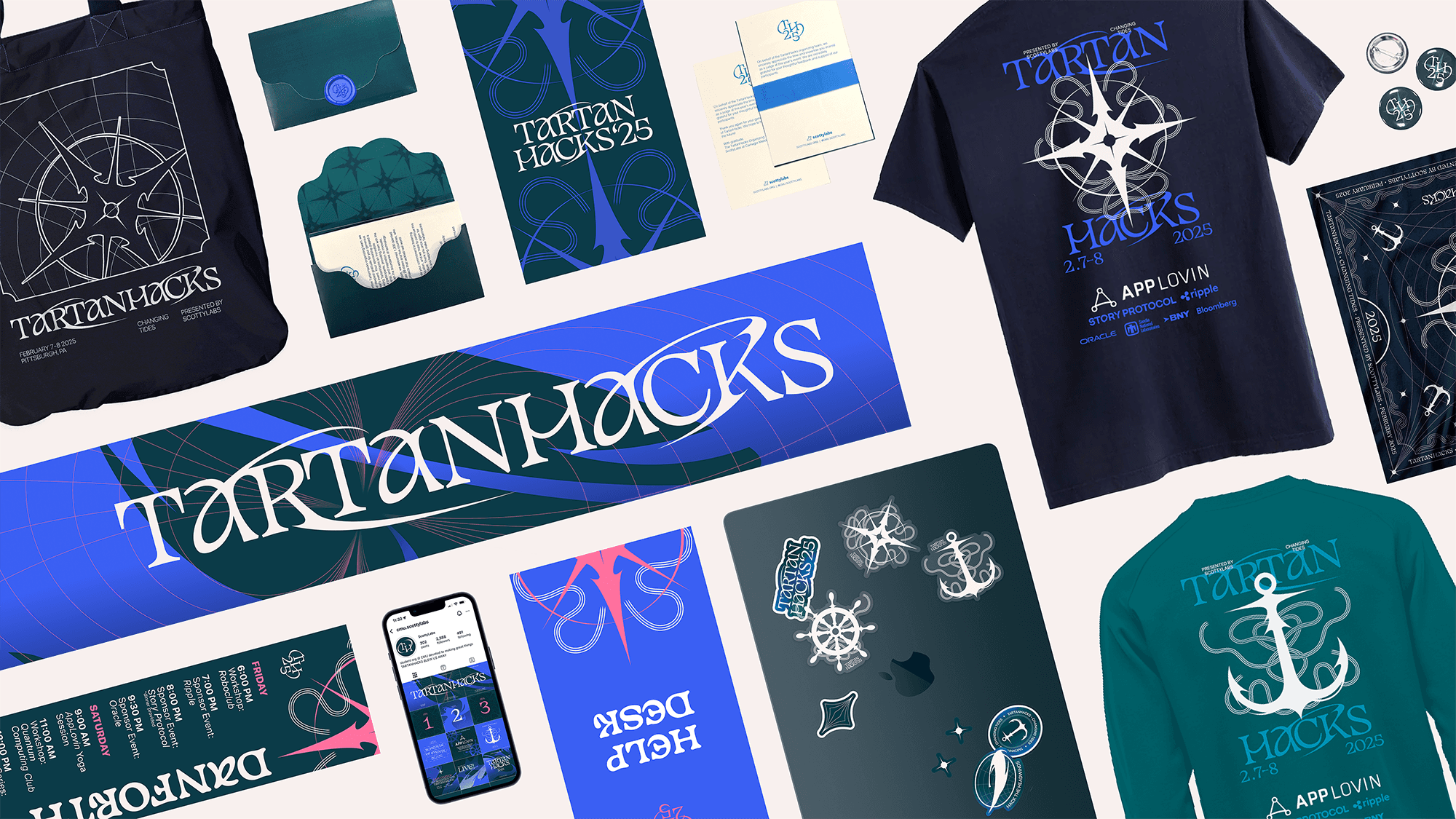 TartanHacks is Pittsburgh’s largest annual hackathon, hosted by Scottylabs—Carnegie Mellon's tech and design club—and attracting coders from across the US and abroad. As Director of Design, I led a team of designers in creating the branding and brand application for 2025’s theme: Changing Tides. This was carried out across merchandise, banners, event signage, website design, social media, stationery, and more.