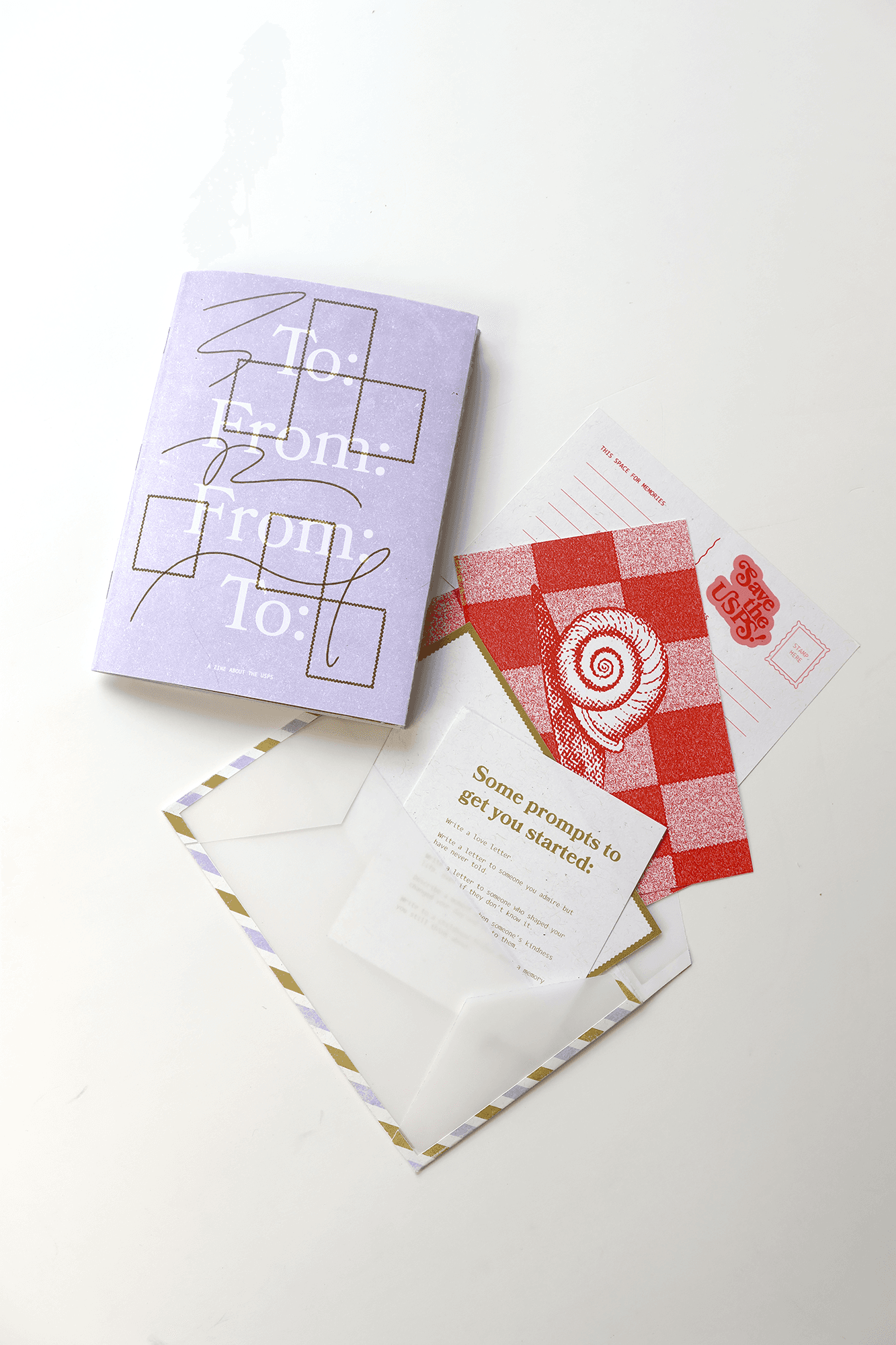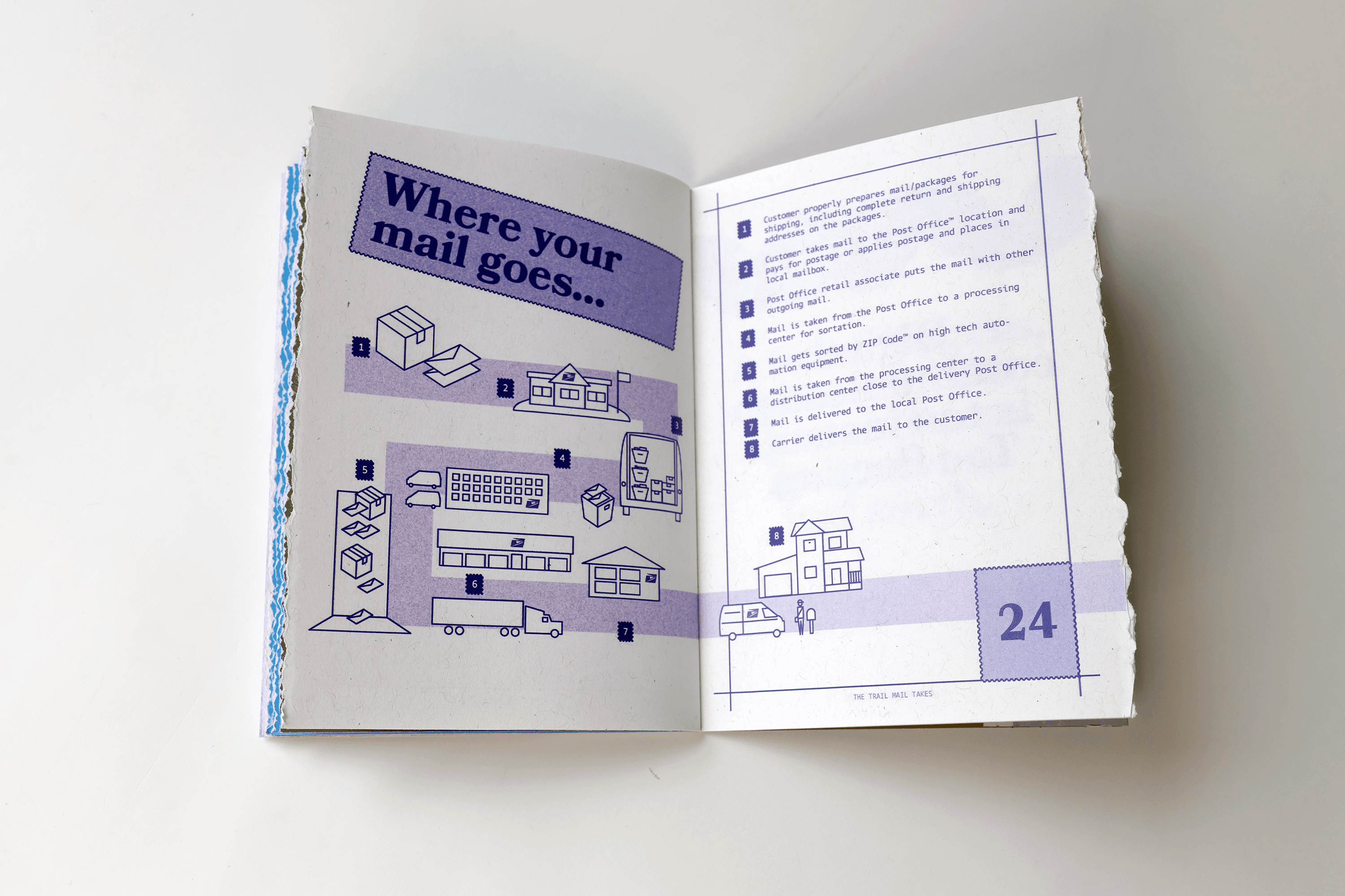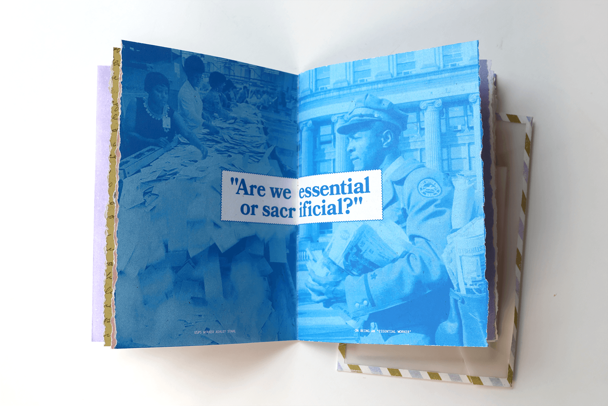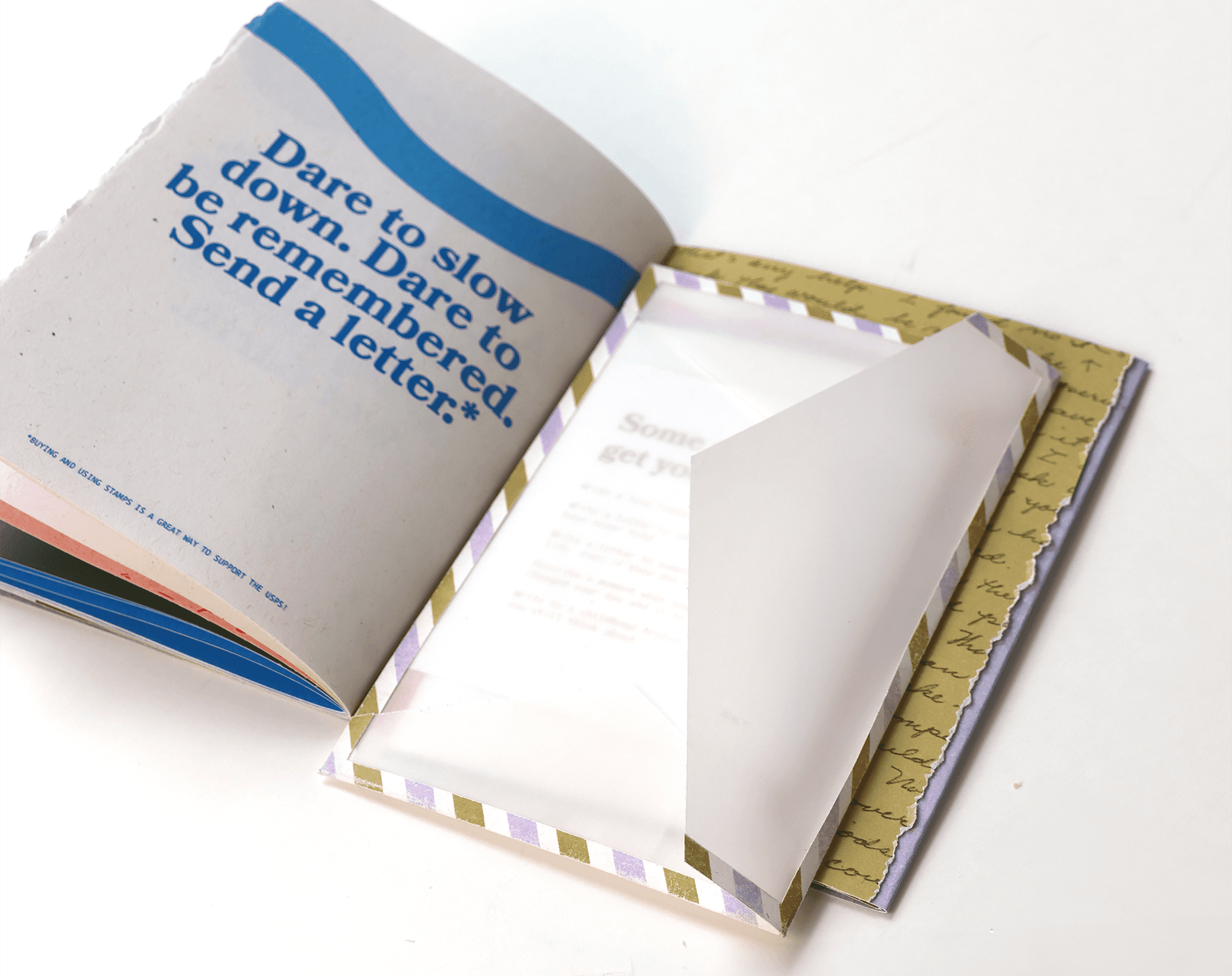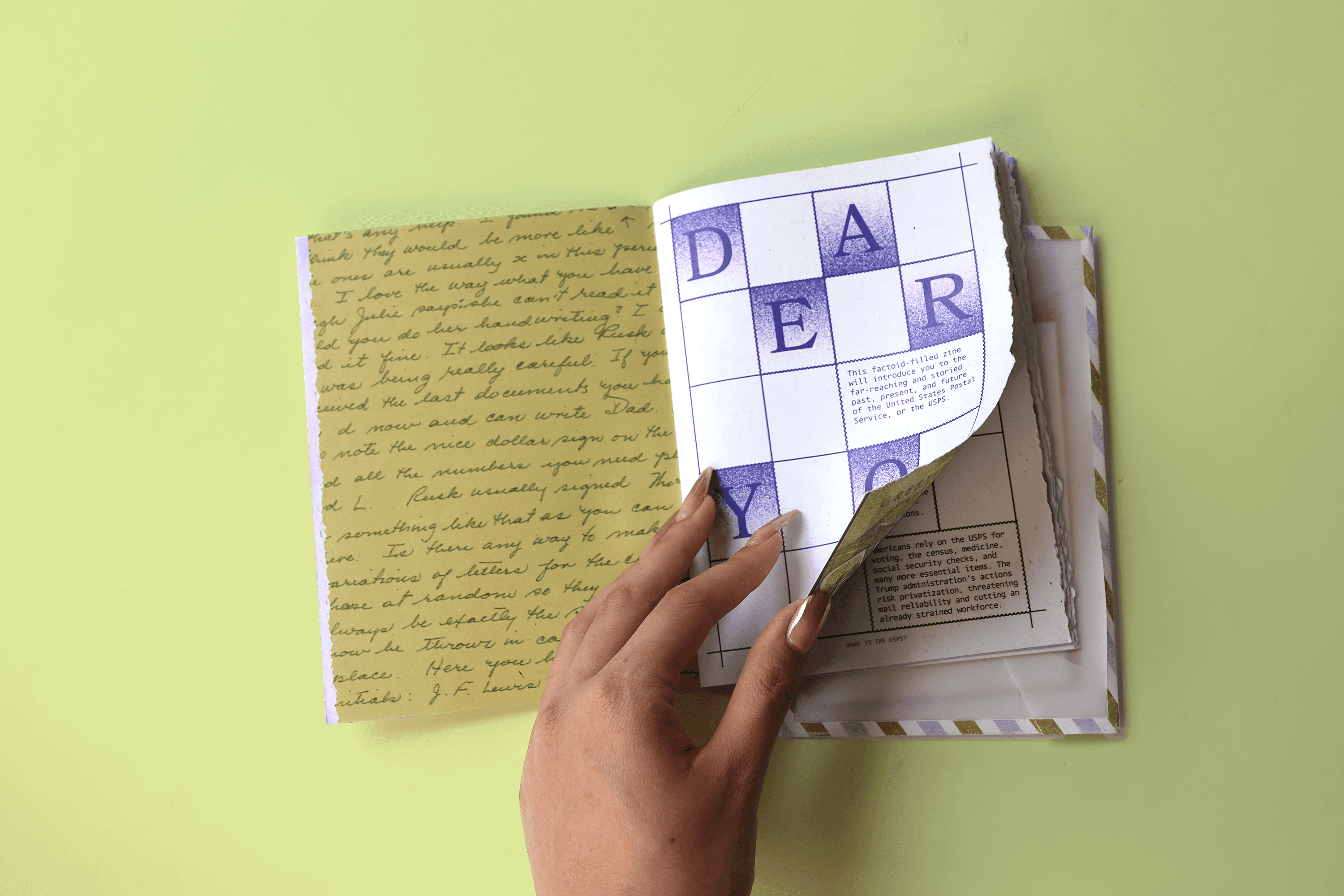 A deckled-edge zine detailing the history of the USPS, with postcards and letter prompts to encourage readers to use the mail.